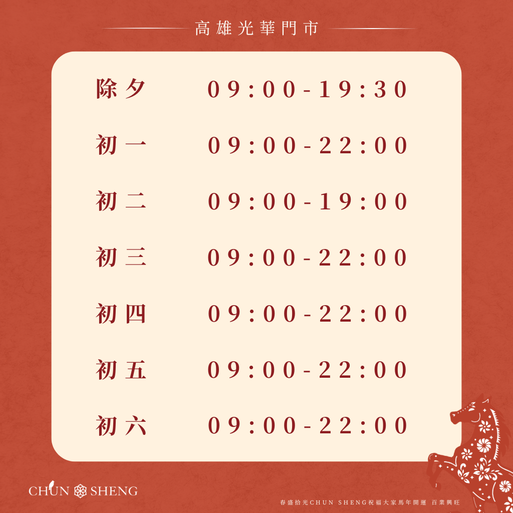 春盛拾光 CHUN SHENG|2026 農曆春節門市營業時間調整
